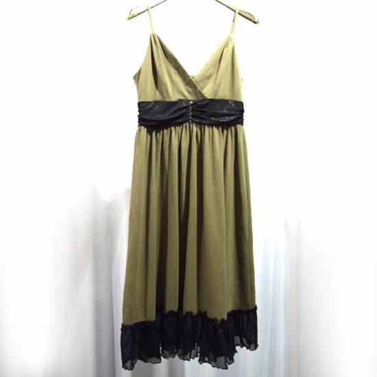 The spaghetti strap dress is adorned with black wrinkled fabric.