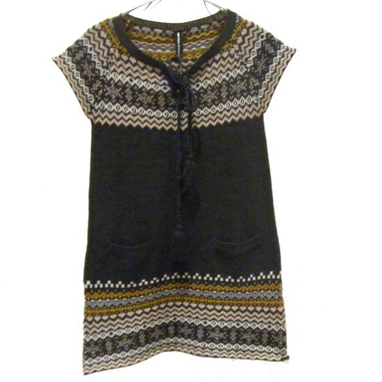 The dress is suitable for winter or autumn which is made of warm material of wool and acrylic. The grey dress has short sleeves and the collar can be adjusted tightly with a knitted rope. Some patterns in various colors are knitted on the dress for embellishment.