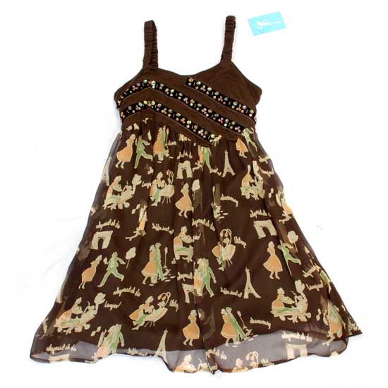 This ladies' dress comes with a one-piece cut with spaghetti straps. Its patterns exude a romantic French style with the dancing figures and the Eiffel Tower. The harmonic color combination makes it an elegant choice for summer.