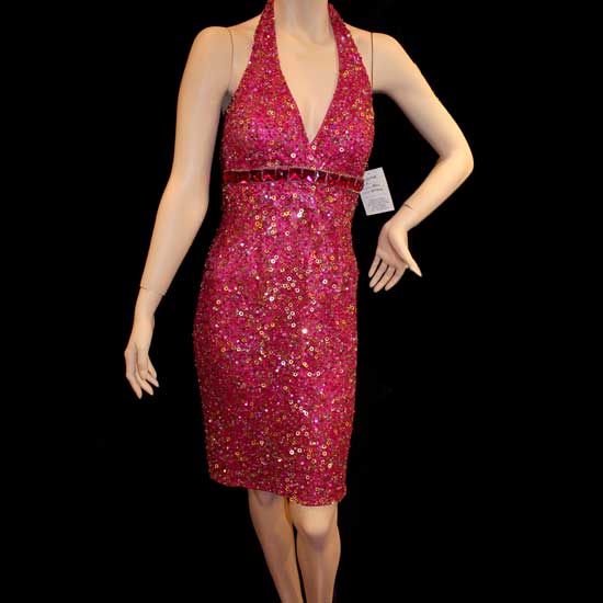 This ladies’ dress comes with a deep V-neck for a glamorous design. The allover shimmering sequins look attractive. The pyramid embellishments add uniqueness to the entire style.