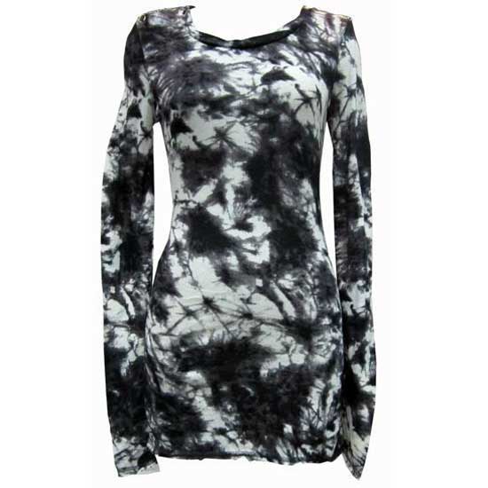 This fashionable ladies' dress applies advanced tie-dye techniques to produce bold free-flowing prints. The dress features a scoop neck, long sleeves and a flattering slim waist. The raw edge seams enhance the casual style of this trendy ladies' dress.