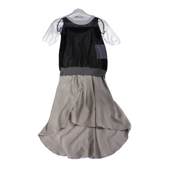 This stylish ladies dress consists of a sheer black short-sleeve top and a gray calf-length skirt. The trendy dress is accented with an asymmetrical hemline. This unique dress is perfect to accentuate any casual look.
