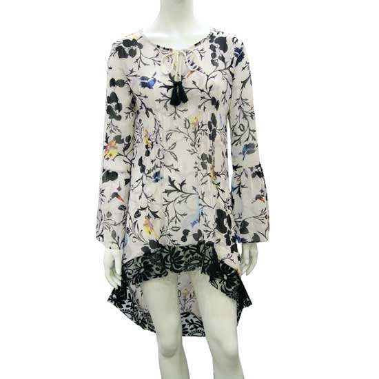 This ladies’ polyester dress grabs your attention with its branch-like patterns on the white background. The drawstring on the neck and the high-low hem impart an extra touch to the look. This long-sleeved polyester dress is surely easy to mix and match.