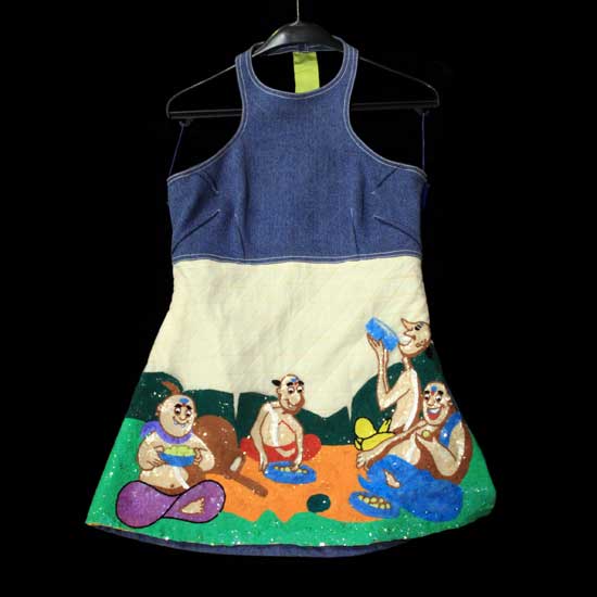 Displayed is a ladies' dress that is decorated with lovely cartoon characters on the skirt. The bodice shows the color of denim with a halterneck design. This dress has sequin embellishment for added fashion.