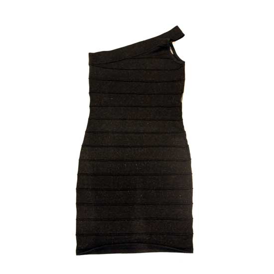 This ladies’ dress in black features a single-shoulder design for an asymmetric look. The shiny Lurex yarns add a spicy touch to the appearance. This succinct yet feminine one-piece dress is suitable for various occasions.
