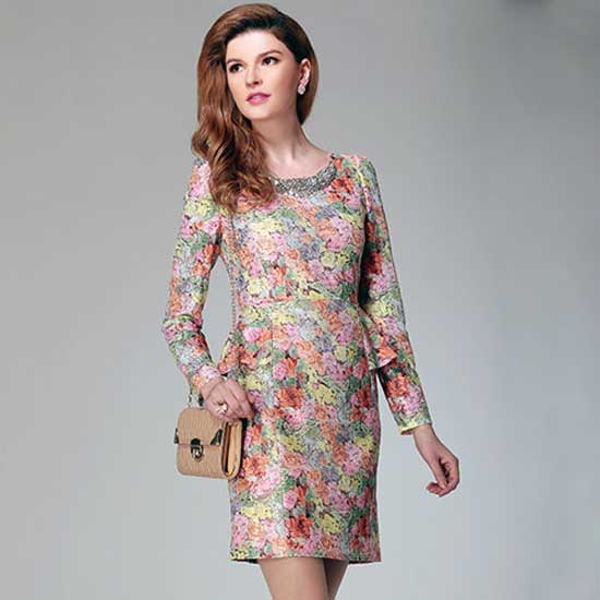 This is a ladies' one-piece dress that with a classic round neckline, long sleeves and a slim-cut bodice. The allover colorful floral prints add a touch of style to the whole piece. This ladies' dress is soft and comfortable to wear.