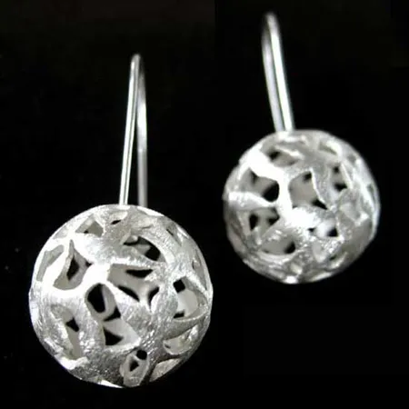 As shown is a pair of ladies’ earrings coming with globe-shaped pendants. The little globes are carved with cutout bird patterns with brilliant craftsmanship. Put on these earrings to add a sense of elegance to even your casual look.