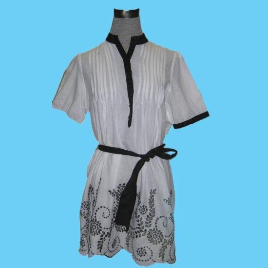 The stylish ladies' tunic comes with a band collar with black trim and asymmetrically black-trimmed sleeves. It features elegant floral embroidery at the bottom and a wave hemline. Also highlighted are the vertical pleats along the upper front and a self-tie waist. Soft and breathable fabric makes the piece an ideal option for ladies to add a splash of color to their summer closet.
