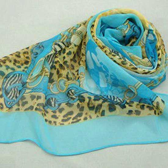 This ladies’ scarf features leopard patterns and blue rims for an attractive look. Made of emulation silk, the scarf ensures excellently soft touch. This captivating scarf makes an ideal accessory for summer days.