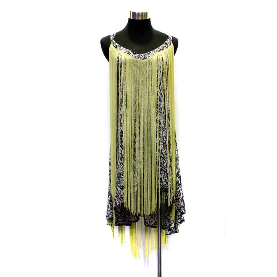 This ladies' evening dress features an allover colorful pattern which displays a vibrant style. The front and back are covered with long fringes for an elegant touch. This distinguished evening dress simply makes the wearer stand out in a party.
