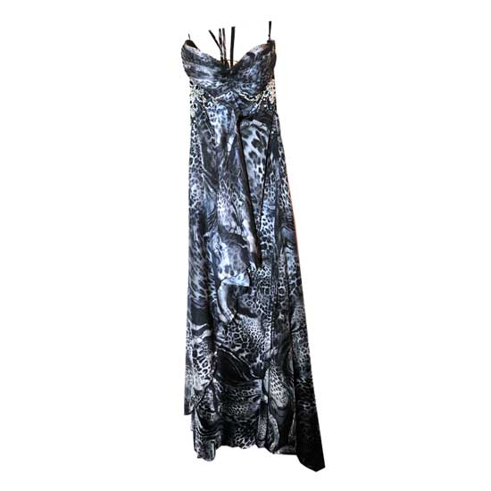 This ladies' evening dress spotlights exotic animal prints. The stunning evening dress is accented with beading and sequin details on the waist for added glamor. The sweetheart neckline and slim shoulder straps complete the design of this piece.