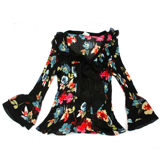 The ladies' long-sleeve top features a nature's theme with colorful floral patterns. It comes with a ribbon decoration on the neckline and flared cuffs. Set this flamboyant top off with plain-colored pants or a skirt.