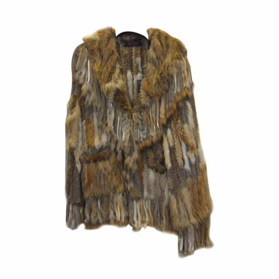 This is a knitted fur coat in brownish colour tone. The knitted ladies jacket is knitted by rabbit, raccoon and red fox fur which makes it warm-keeping. It is designed in small vertical straps pattern.