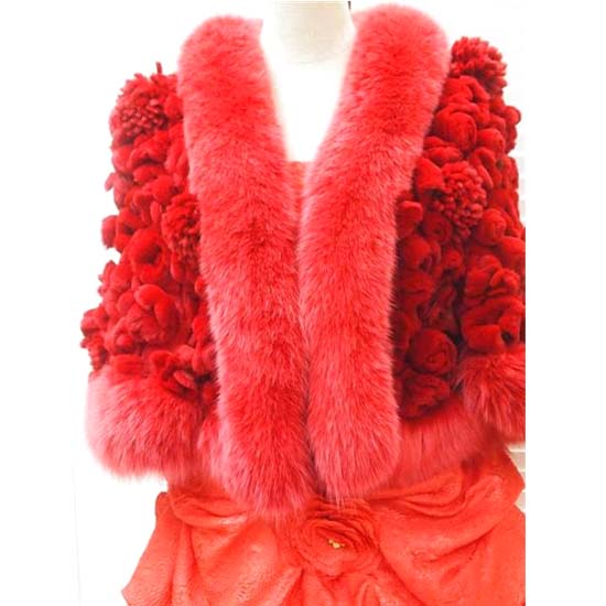 Showcased is a ladies' fur jacket in vibrant red. It is finely made with delicate workmanship. Add this fur jacket to your fashion wardrobe.