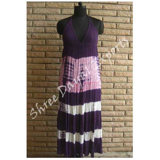 The ladies' halter dress is covered with stripey tie-dyed prints, showcasing a timeless style. It is styled with a sexy V-neckline and a fitted empire waist. Hit the beach with this romantic tie-dyed halter dress.