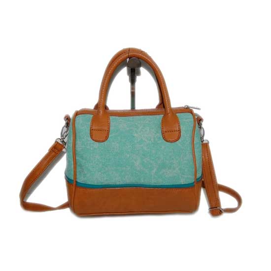 This stylish ladies' handbag features a green and brown design. The square-shaped handbag is fitted with rolled handles and a long shoulder strap. The top zipper closure finishes the design of this handbag.