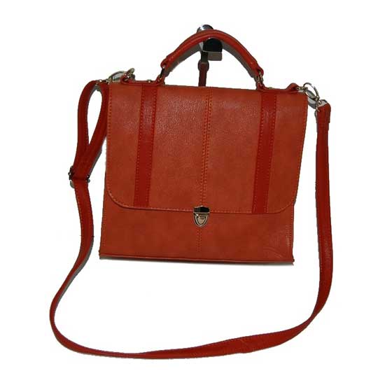 This leather-textured handbag features an orange color. The compact, square-shaped handbag features a front buckle closure. Designed with a top handle and a long shoulder strap, the versatile handbag is perfect for hand and shoulder carrying.