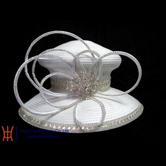 This elegant hat features sparkling decorations along the rim and the side band. A splendid sparkling adornment with multiple loops is fixed on the hat. Clean and classy, this subtle ladies’ hat is ideal for formal occasions in the day.