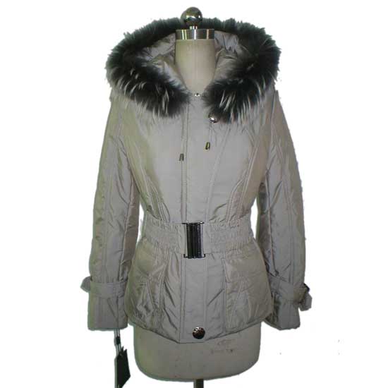 This ladies' jacket comes with a slim hip-length cut. The plain-gray design is embellished with a raccoon hood for highlighted style. An elastic belt is added at the waist to showcase a fitted cut.