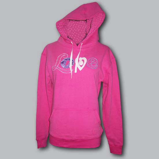 This hoodie is perfect for a fashionable sporty look. It is sharp pink in color with stylish embroidery and graphics on the front. The soft fleece material keeps ladies warm and in style.