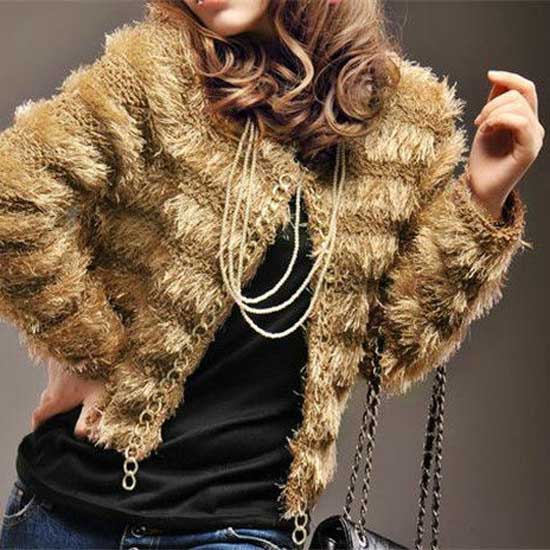 This fabulous ladies' jacket is designed with fur arranged in striped patterns. The golden metallic chain details add a chic touch to this piece. This jacket lets you shine in any party.