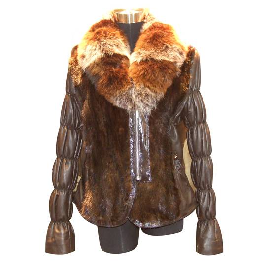 This is a brown coloured ladies' jacket which is decorated with mink and fox fur. The jacket is long sleeved and of open chest style.