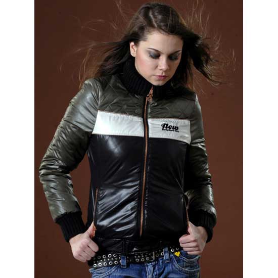 This cool biker jacket shows a strong character for modern ladies. The jacket comes with a slim short cut and a zipper front. The black, gray and white shell is added with a glossy finishing to show enhanced style.