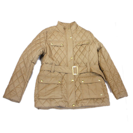 The stylish ladies' jacket comes with a stand collar and spacious pockets. Featuring golden studs and a buckle, the jacket has a self-tie belt for a beautiful look. The zippered front with a flap completes this classic jacket.