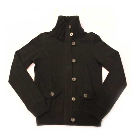 This ladies’ jacket comes in black overall, which is easy for you to mix and match. This classic jacket is made of 65% cotton and 35% polyester, which ensure wearing comfort and durability. This piece features long sleeves, two side pockets with buttons, a stand-up collar and a button front closure with metallic buttons.