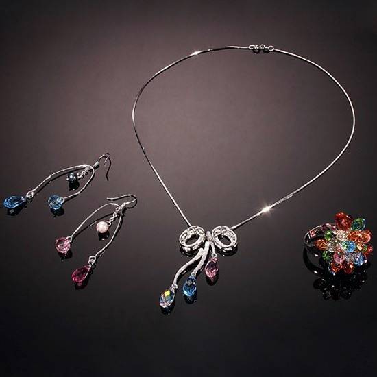 The elegant jewelry set includes a necklace, a ring and two earrings, all made of classy gemstones. The necklace features a delicate ribbon-shape silver pendant embellished with pink, blue and transparent crystals. The earrings come with an ear-thread design that dangles with crystals below the ear. The ring is fully ornamented with colorful crystals to boast an eye-catching indulgence.