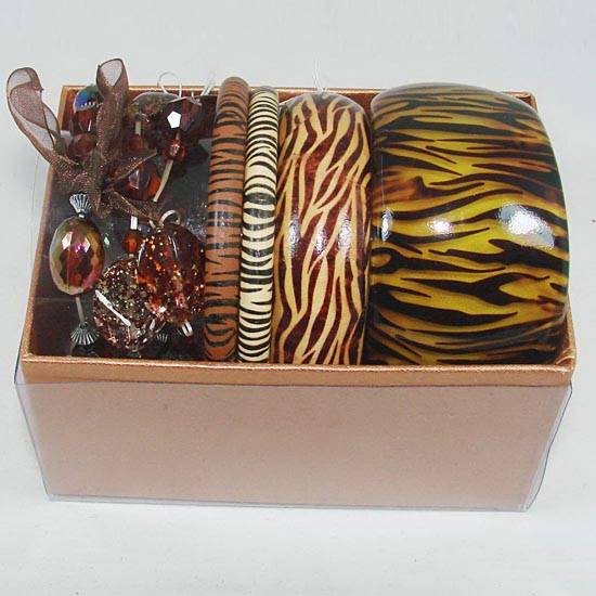 This jewelry set includes 4 bangles and a bracelet. They are decorated with beads and leopard patterns for added glamour. This jewelry set makes a pretty way to dress up your everyday ensemble.