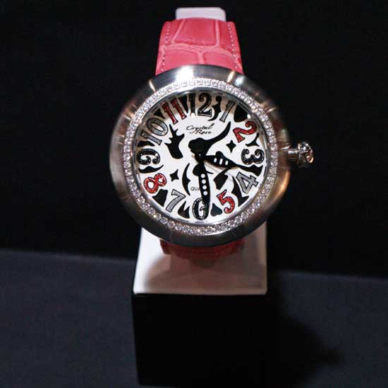 The ladies' jewelry watch features decorative stones on the bezel. It comes with an alligator leather strap in vibrant pink. The artistic dial makes it stand above the rest.