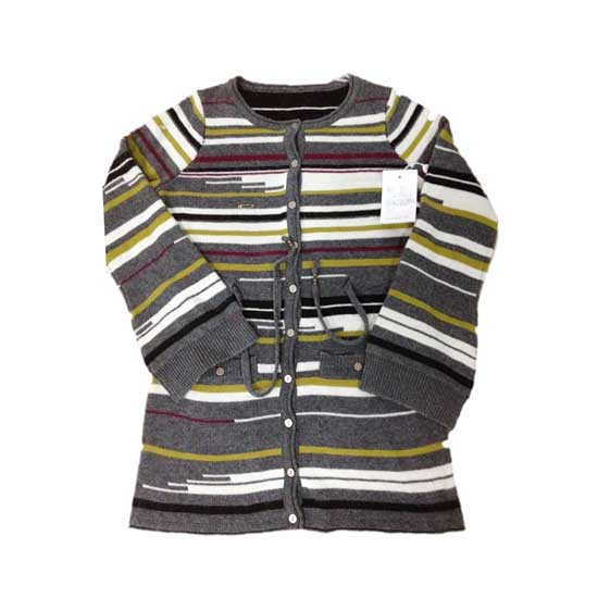 This is a ladies' knitted cardigan sweater that is designed with a classic round collar and long sleeves. This cardigan sweater is accented with attractive striped patterns in different colors. The single-breasted button front completes this cardigan sweater.