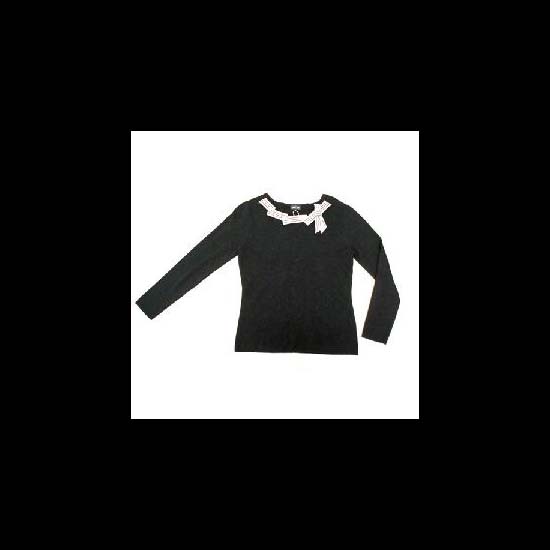 The jumper is round-necked and is decoratedby a white ribbon on the collar