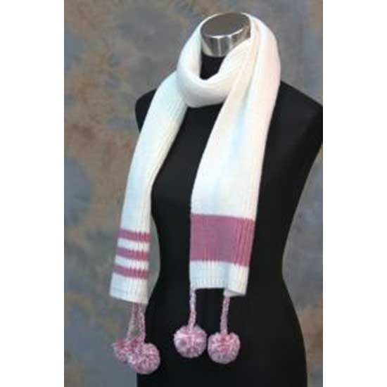 Featured is a ladies' scarf showcasing a graceful design. The pure white body is adorned with three stripes at one end and a thick stripe on the other, allowing the wearer to change styles. The ends are decorated by pom-pons, adding a lovely touch to the wearer.