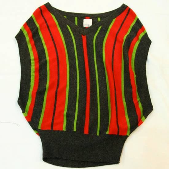This ladies' knitted top has vertical stripe patterns in sharp red, green and gray colors. It features an exquisite sleeveless design. This cheerful top provides an exciting element to your collection.