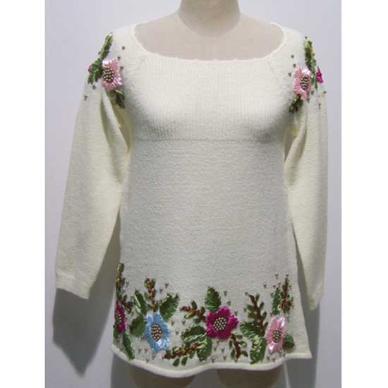 As shown is a beautiful ladies’ top coming with a scoop neck and middle sleeves. The pure white top boasts delicate floral embroidery on the shoulder and hem. The elegant design goes well with a range of pants or skirts.