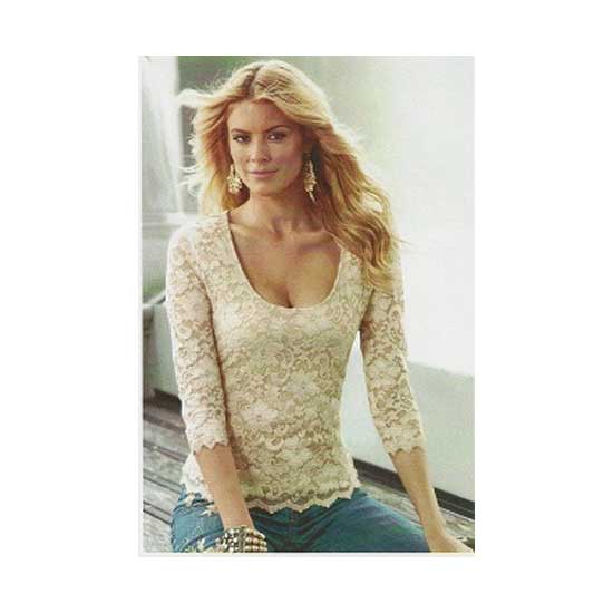 Displayed here is a ladies' lace top with 3/4 sleeves. The jewel neckline conveys a touch of elegance. Add this sophisticated top to your fashion wardrobe.