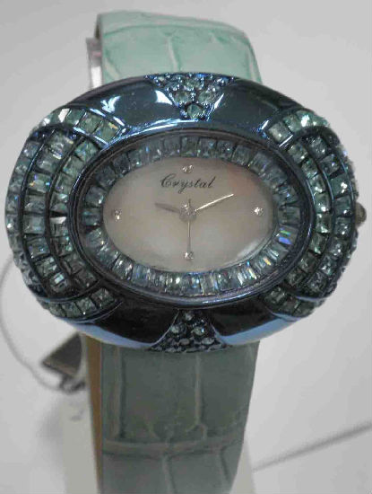 This ladies timepiece boasts an elliptic brass case in blue IP plating adorned with inlaid of white stones on the case. Genuine leather band in crocodile style accents a stylish look and offers comfy wearing. Japan movement provides you with accurate time telling.
