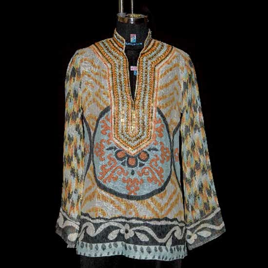 This ladies' long-sleeved blouse features handmade embroideries for a delicate touch. The golden-toned ornaments on the collar and placket further complement the look. This ethnic linen blouse is great for showcasing your unique taste.