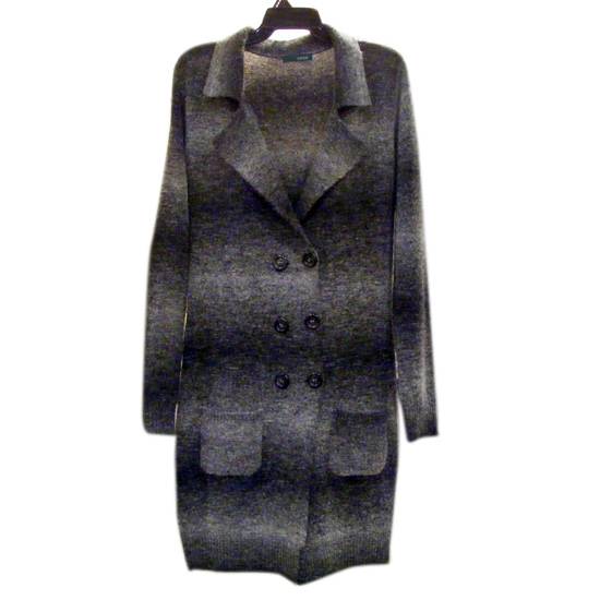 This is a ladies' coat which has a length up to the knee of the wearer. It has a very low collar and has a double-breast design with densely packed buttons.