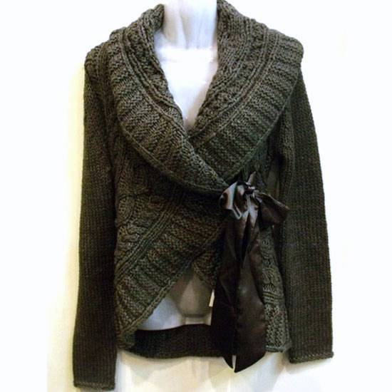 The ladies' cardigan features a V-neck and long-sleeve design. It is decorated with a ribbon for added style. This stylish cardigan makes an excellent winter clothing item.