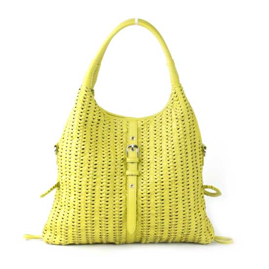 This ladies’ special mesh tote bag comes in a solid yellow hue for a fresh look. The fashionable roller-buckle belt highlights the design immediately. A long strap is also included for cross-body wearing.