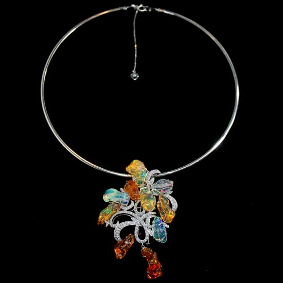 This splendid necklace boasts an 18k gold setting paved with sparkling diamonds. A floral shape decoration with colored stones makes the design cheerful. This contemporary design matches your apparel perfectly.