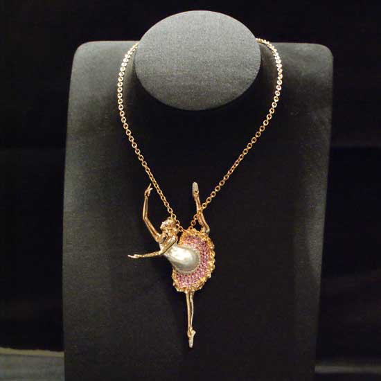 The necklace here flaunts an exquisite ballerina-shape pendant. The ballerina is crafted in a graceful shape, with a South Sea pearl embedded on its body. The skirt is embellished with pink sapphires to exude adorable sparkles.
