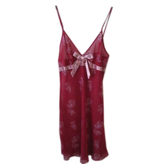 Showcased is a nightgown boasting a glamorous design. The nightgown looks alluring with a deep V-neckline and spaghetti straps. A ribbon bow is added to concert with the floral prints.