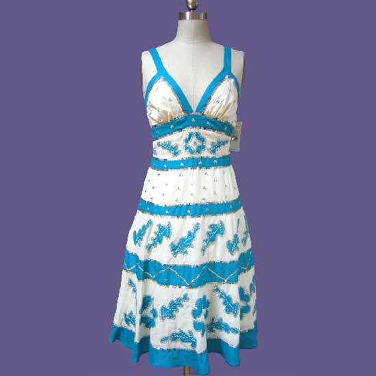 This beautiful dress is in the hues of white and blue for a touch of elegance. This sleeveless dress features a deep V-neckline, making an alluring statement. The delicate embroidery is added for an extraordinary design.