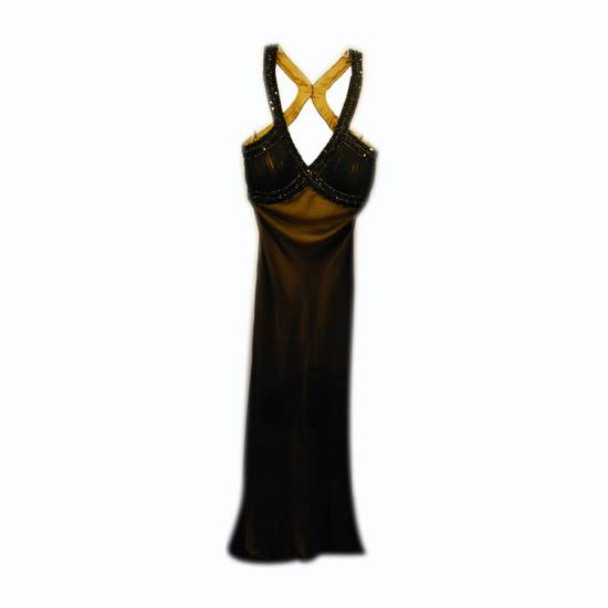 This shiny one-piece party dress has a deep V-neckline and a pair of shoulder straps. The classical design with sparkling beads embedded on makes this evening party gown everlasting. This silk dress is suitable for grand occasions.
