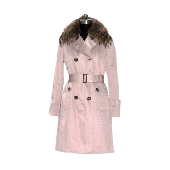 This is a ladies' overcoat with a gray finish. It is attached with a waistband for a stylish touch. The collar and shoulder areas are covered with fluffy materials to enhanced elegance.