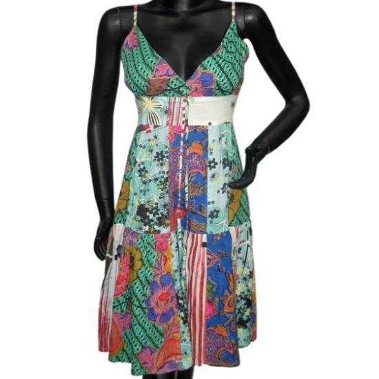 This colorful dress comes with a patchwork pattern of different printed fabrics. It features a deep V-neckline, an empire waist and spaghetti straps. The ribbon elastic on the back provides a slim shape. This bright dress promises to get you attention wherever you wear it.